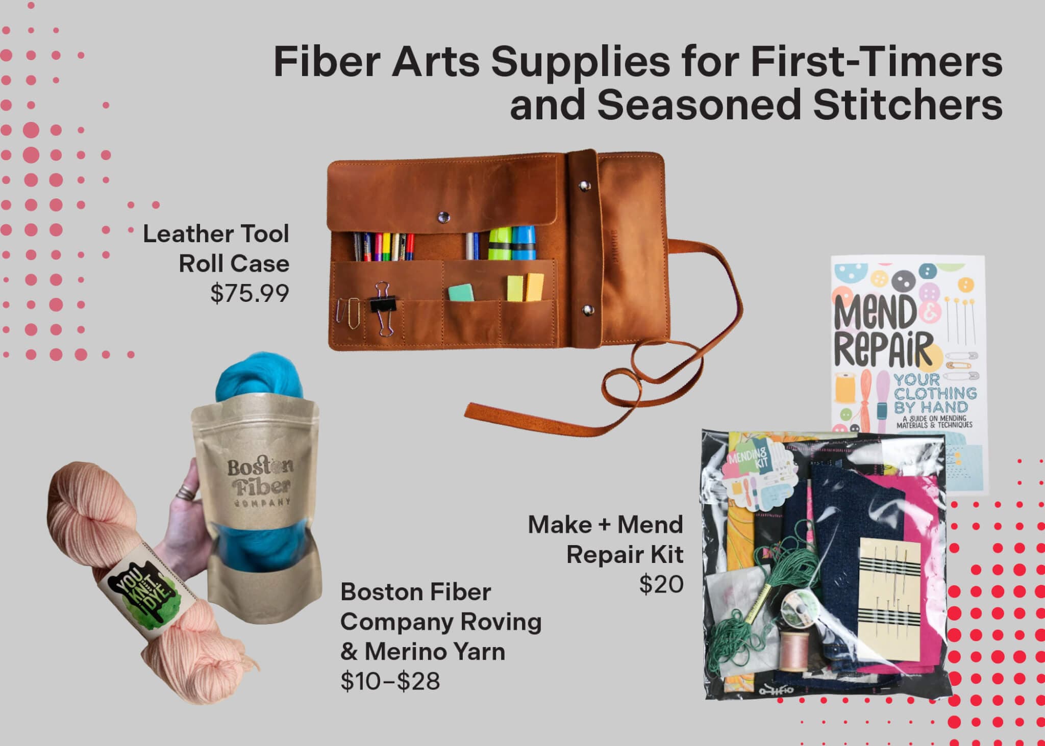 Isolated gift items, including clothing, home wares, and art-making tools, on a patterned background.